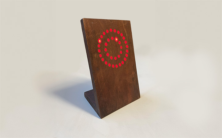 A slightly more futuristic clock design that displays an analog face using 12 LED lights behind a thin wooden pane, with a hidden touch sensor to set the time.
