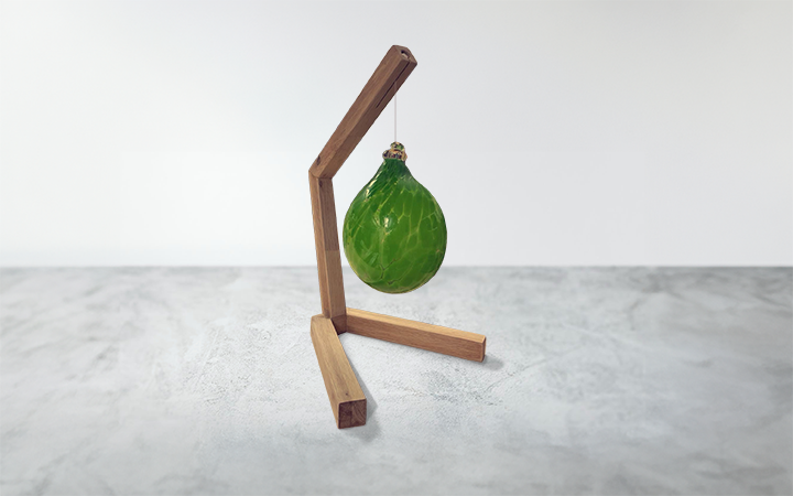 The same friend that wanted to build a TV bench, had also blown his own glass ornament, and needed a way to display it. We opted for a more angled design, to counteract the more rounded shape of the glass. You can even spot it hanging out in "Tvärsnitt".